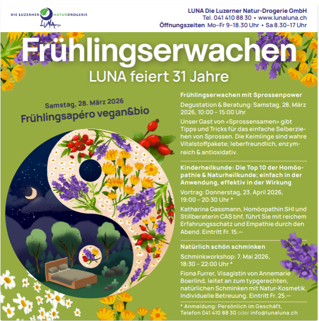 Sämtliche Mitarbeitende der LUNA Natur-Drogerie sind Fachpersonen und haben eine vierjährige Grundausbildung zur Drogistin/Drogist EFZ abgeschlossen. Anschliessend vertiefen LUNA-Mitarbeitende ihr Wissen in individuellen Fachgebieten; dort sind sie zusätzlich ausgebildet. Die LUNA Natur-Drogerie ist Ausbildungsort für jeweils zwei bis drei Lernende Drogistin/Drogist EFZ. Wir dürfen die jungen Menschen während jeweils vier Jahren begleiten.